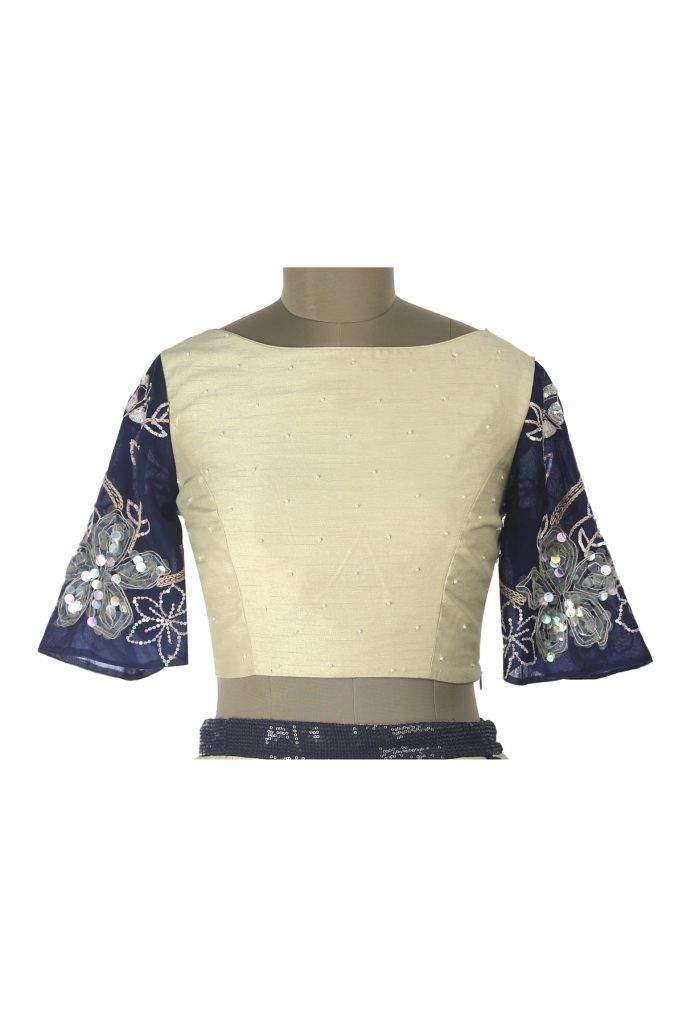 Are you looking for a perfect outfit to wear with your navy-blue palazzo pant? Then try out this shiny crop-top! It has anchor thread and sequins embroidery on the sleeves with pearls at the front bodice. Pair this outfit with silver danglers, clutch and high heels.