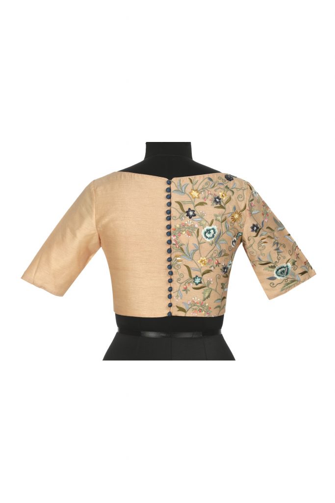 Look gorgeous at parties in this beige crop-top by pairing it with a blue dhoti pant. It has Parsi embroidery at the sleeve & back with potli buttons. Accessorise your outfit with beaded earrings, bracelet and a sling bag.