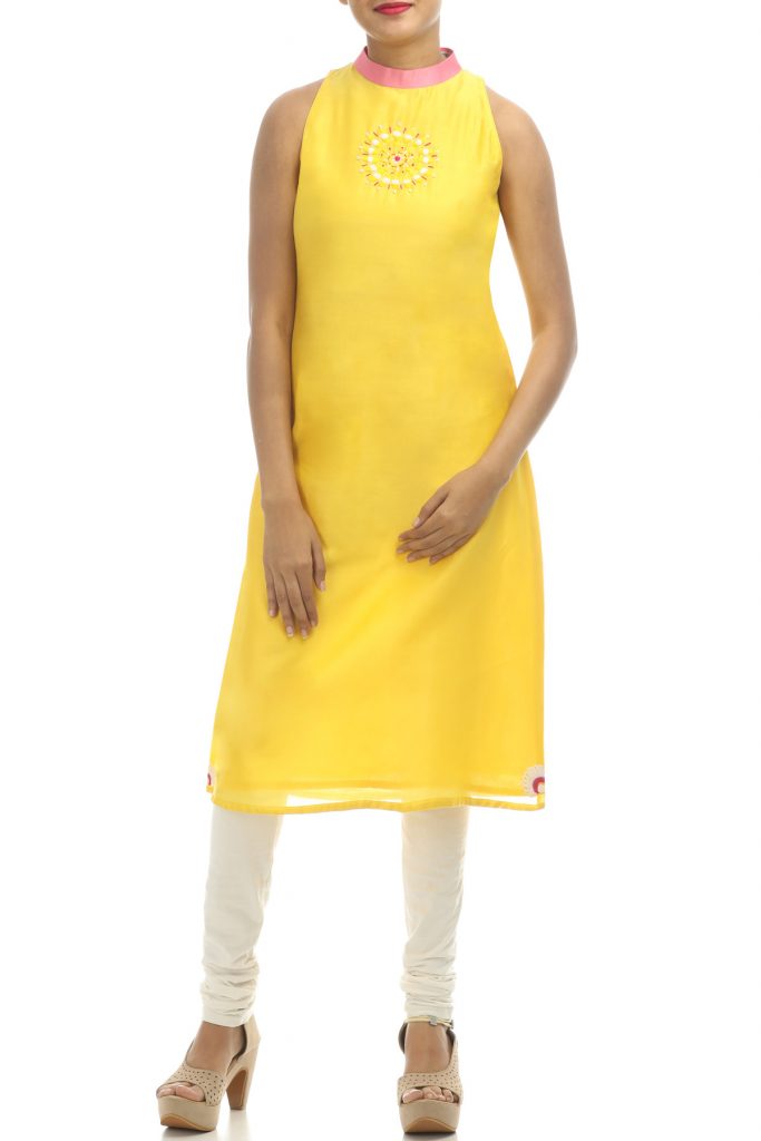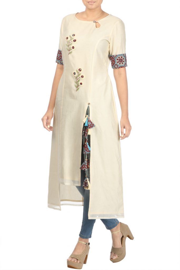 This chanderi kurti has closed neck, in-cut shoulders and embroidery on the front. Pair it with white palazzos to add sensuality to the outfit. Team up this tunic with floral earrings and stylish wedge heels.