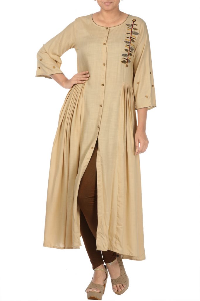 This lovely pleated rayon tunic is an epitome of comfort in trend. It has bell sleeves with scattered buttons and is decorated with dori & ajrak embroidery. The delicate pleats of this kurti add an interesting element. Team it with statement jewellery and a stylish clutch to get an edgy look.