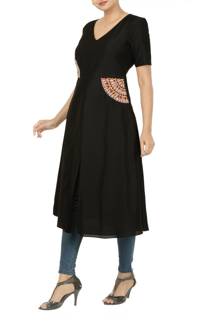 Mirror embroidery was born from the fashion of Mughals. Popularly known as the shisha embroidery, mirror-work is a more crafty form of embroidery than the traditional one. Kurtis with mirror works look artistic, fancy & make a perfect fusion with denim pants.