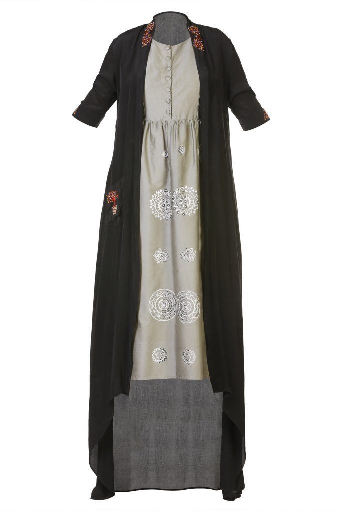 Do you love to wear black? Then this one is for you! It has a high-low black jacket paired with a block-printed grey dress. The jacket has embroidery at the collar and the pocket. The dress has potli buttons at the front. Enhance the look with tassel earrings, bracelet and high heels.