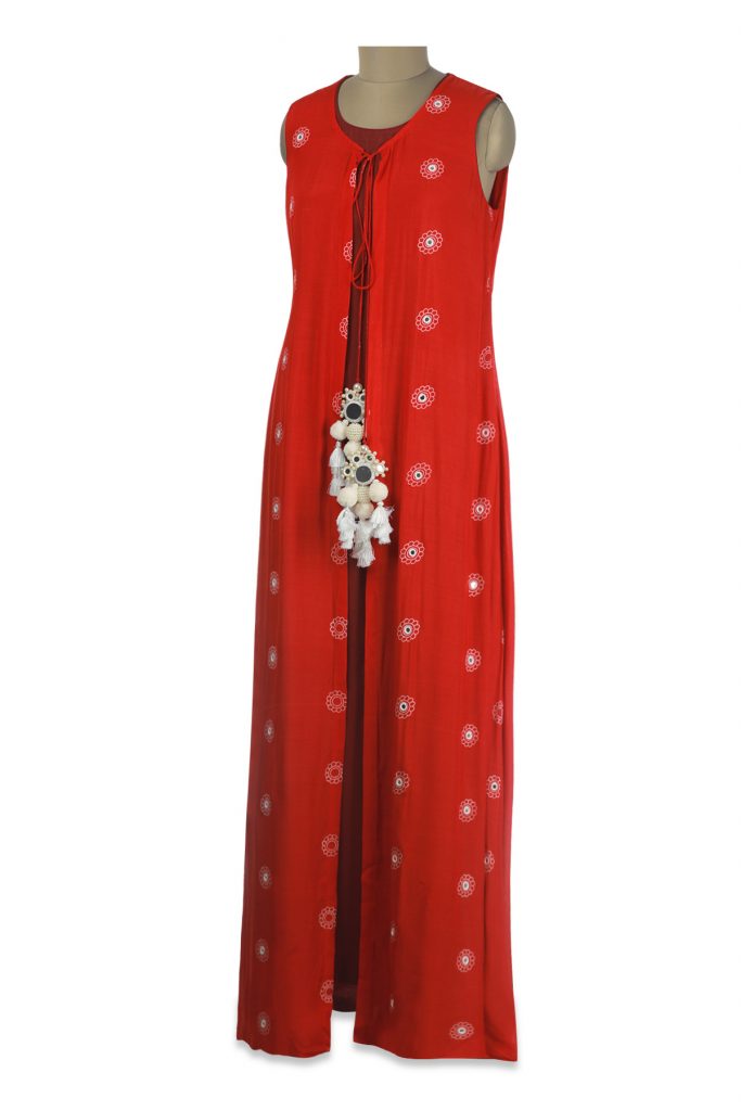 Check out this stunning red & maroon maxi dress having screen prints & embroidery with tassels at the front. Accessorise this outfit with tassel earrings and an embroidered clutch.