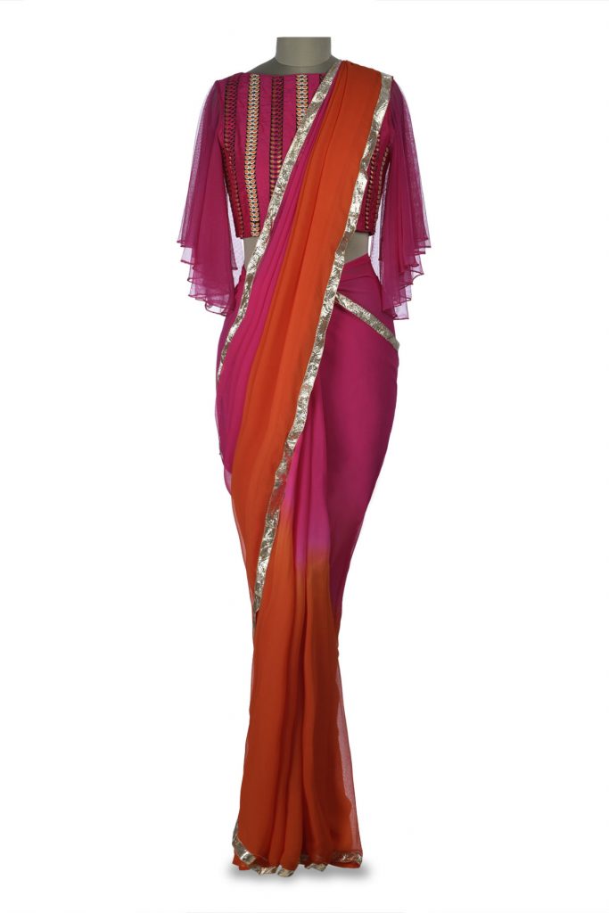 Style in bright hues this festive season with this stunning pink & orange patch blouse having lace designs at the front and flared sleeves. It is paired with orange & pink ombre saree with lampi border. Accessorise this outfit with statement jewellery and high heels to enhance your look.