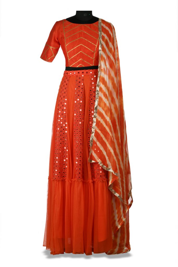 Wear this beautiful orange blouse having gota patti lace at a family gathering. It is paired with a mirror embroidered orange lehenga having panels and an orange leheriya dupatta with lampi lace. A pair of statement jhumkas and an embroidered potli bag will complete the look.