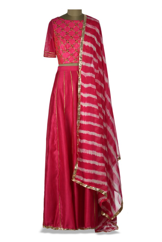 Look stunning in this embroidered pink blouse having gota patti lace and pair it with a pink panelled lehenga having lace along with a leheriya dupatta. Wear pearl dangler earrings and carry a potli bag for an elegant look.
