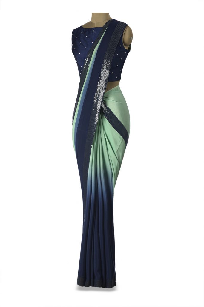 Make a style statement in this elegant sea-green & blue saree-set. It has a sequins embroidered sleeveless blouse and is paired with an ombre blue saree having ruffles on the pallu. Accessorise this outfit with silver danglers and a fancy sling bag.