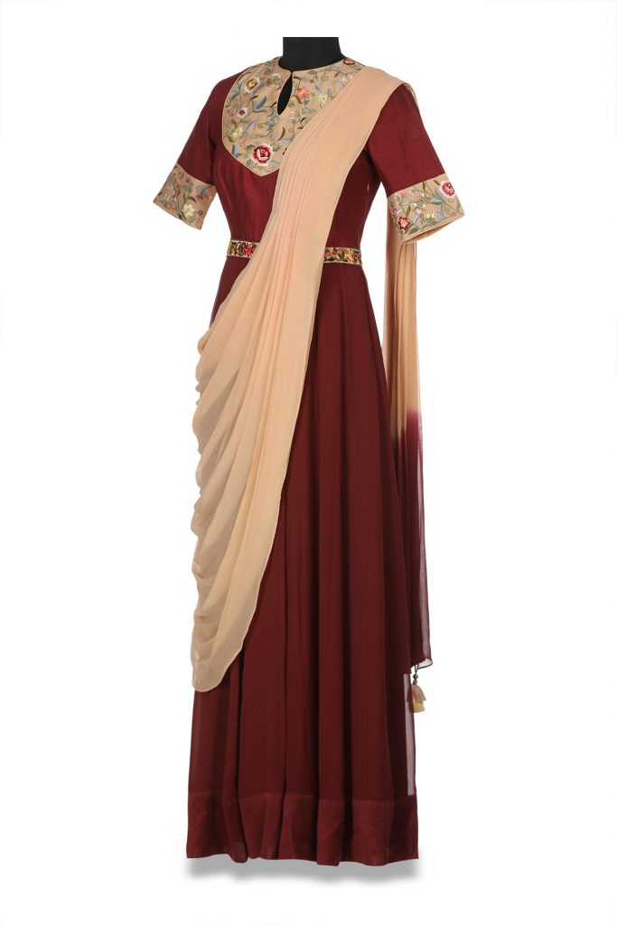 Turn heads at any event in this draped burgundy & peach anarkali. It has Parsi embroidery at the front, waist and hem of the sleeves. It is paired with an ombre peach dupatta. Style this outfit with hoop earrings, an embellished clutch and high heels.