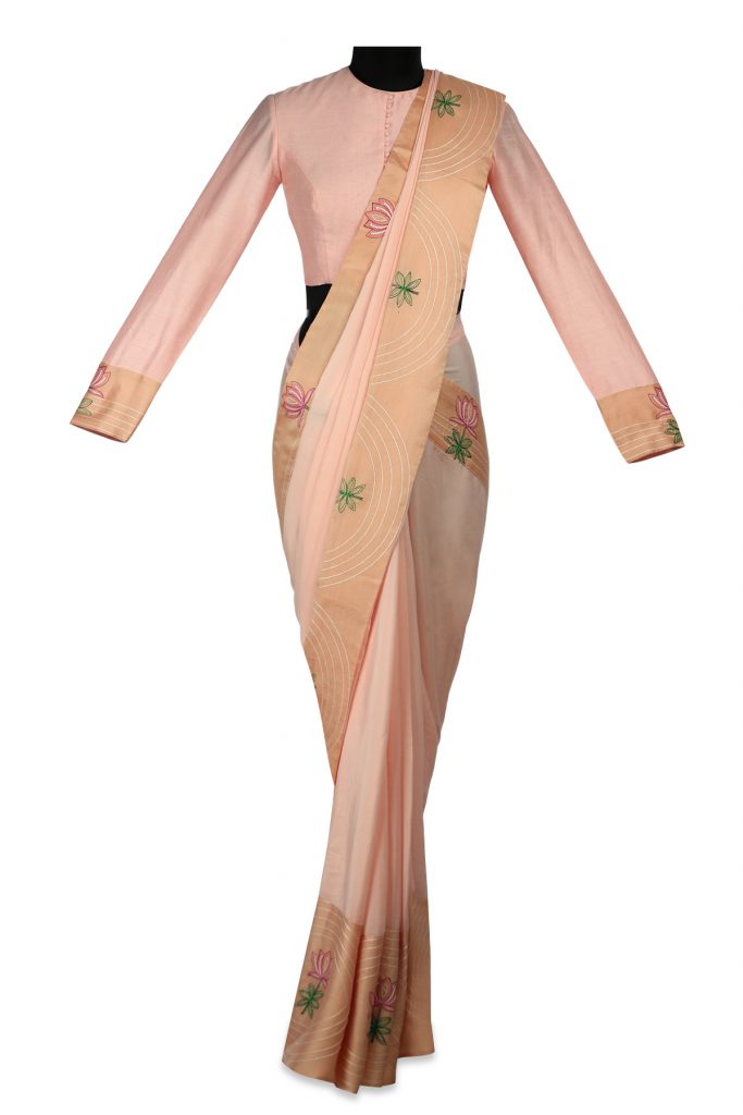 Wear this stunning pastel pink saree-set for family gatherings. The blouse in this set has embroidery at the hem of the sleeves. The paired saree has a peach-embroidered border. Enhance your look with statement earrings and high heels.