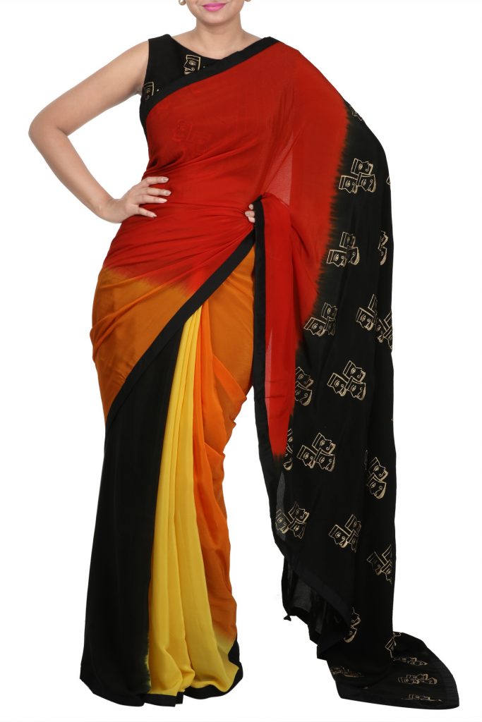 Our designer Saree in black, yellow, orange & red Ombre is an ideal outfit for this traditional event. Made from the rich fabric of chanderi with beautiful block print on the pallu & the blouse, this saree gives the perfect festive appeal.