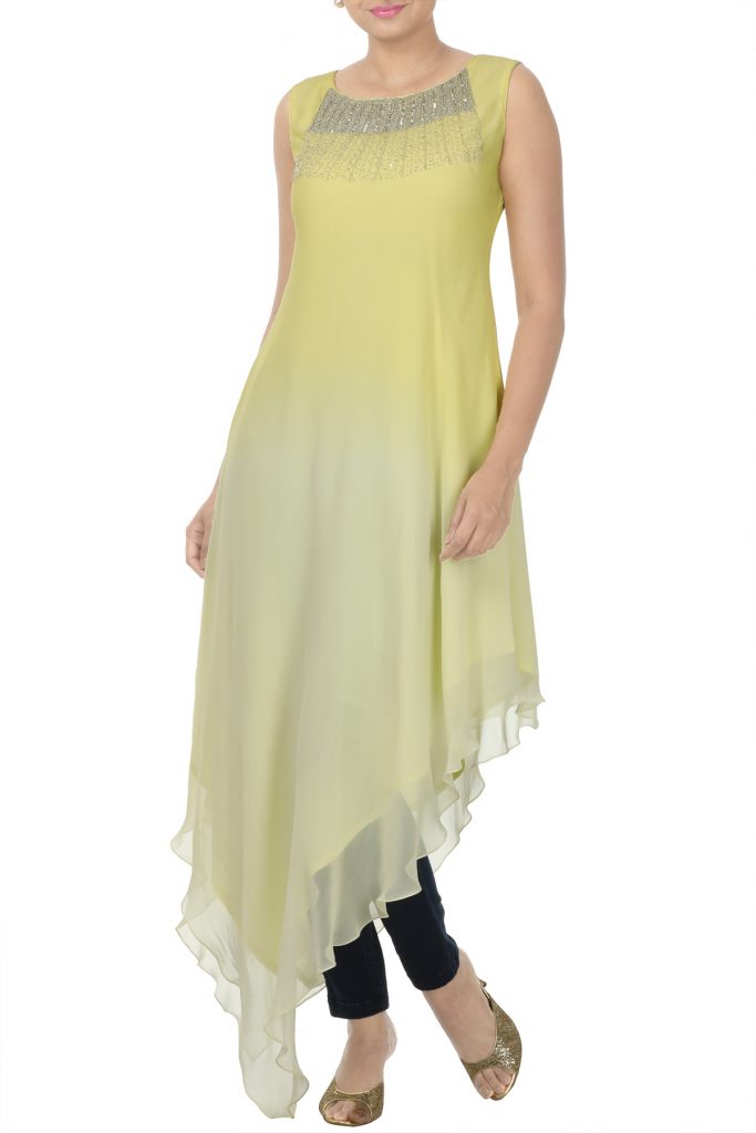 After a tiring day of being drowned in a pool of water and colours, you would certainly want to wear a relaxing outfit in the evening. Undoubtedly, pajamas are favourite wear for the Holi evening, but what if you plan to end your day with a small party? You’d certainly not attend a party in those old pajamas! This asymmetrical yellow and beige ombre tunic with lines of beaded embroidery will make you look splendid and make you feel comfortable throughout the party time.